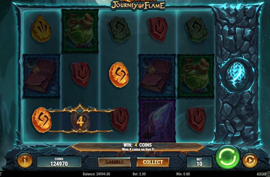 Antes de que se active el sexto rodillo durante las tiradas gratis, Merlin: Journey of Flame se juega en un panel de juego de 5 rodillos y 3 filas con 10 líneas de pago. El sexto rodillo bloqueado añade un emocionante elemento de anticipación al juego base, dando paso a un potencial de ganancias más significativo durante las tiradas gratis de Merling: Journey of Flame.